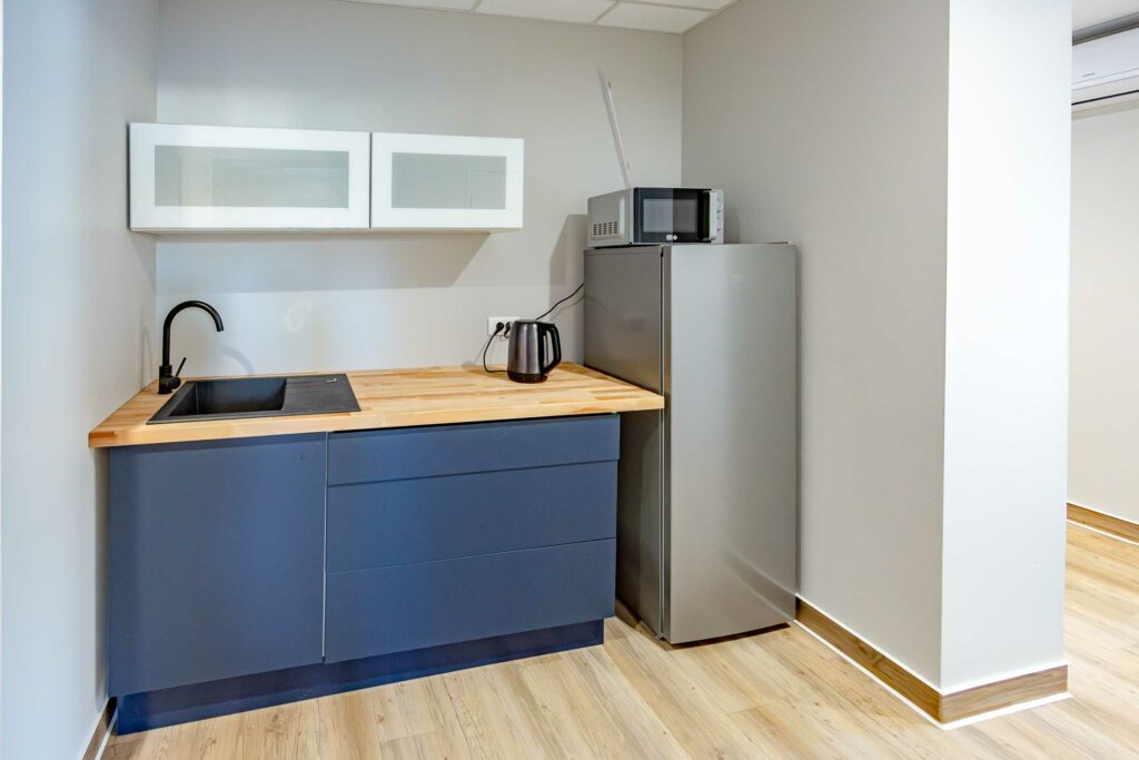 Équipée d'un bureau, d'un fauteuil de bureau, de 2 chaises et d'un lave mains. Service compris : eau, électricité, clim réversible, WI FI.